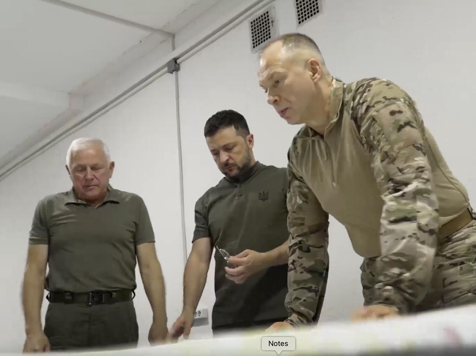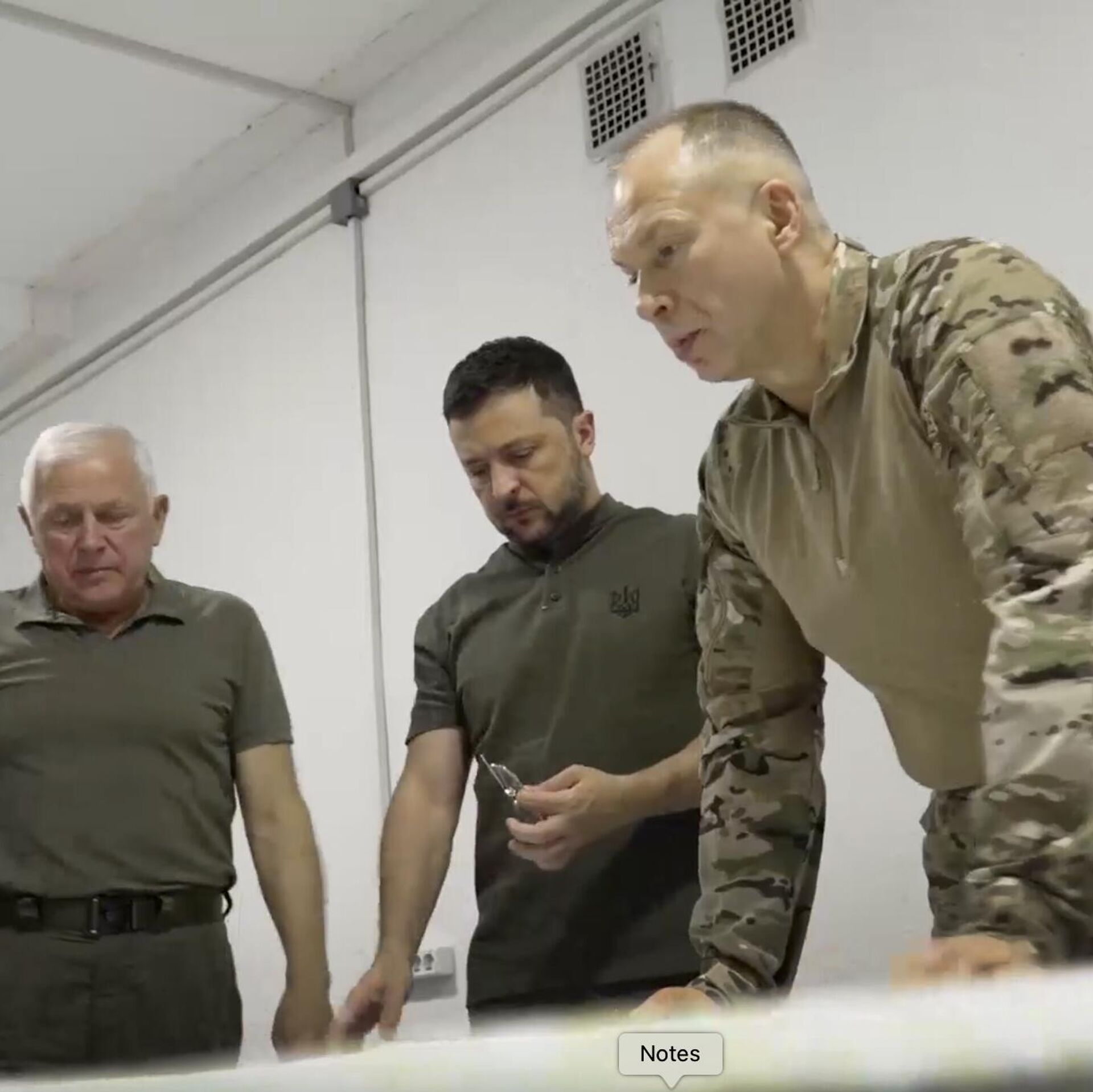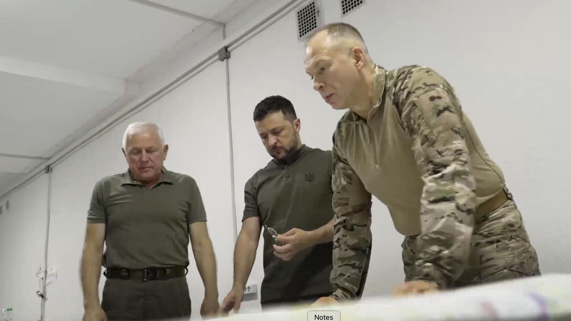 © AP PhotoIn this photo provided by the Ukrainian Presidential Press Office, Volodymyr Zelensky, center, Commander-in-Chief Oleksandr Syrsky, right, look at a map during their visit to Sumy, Ukraine, Thursday, Aug. 22, 2024.