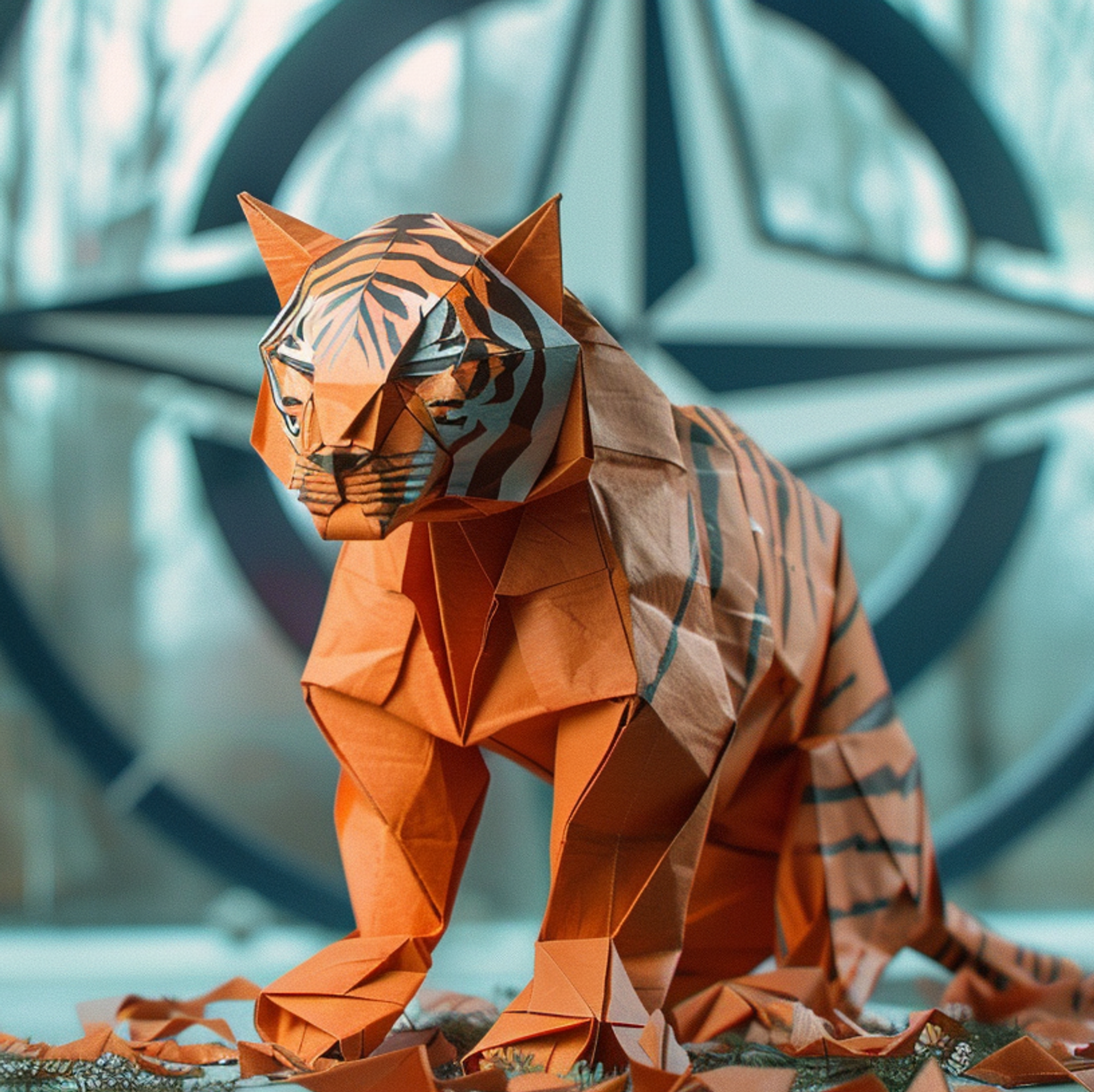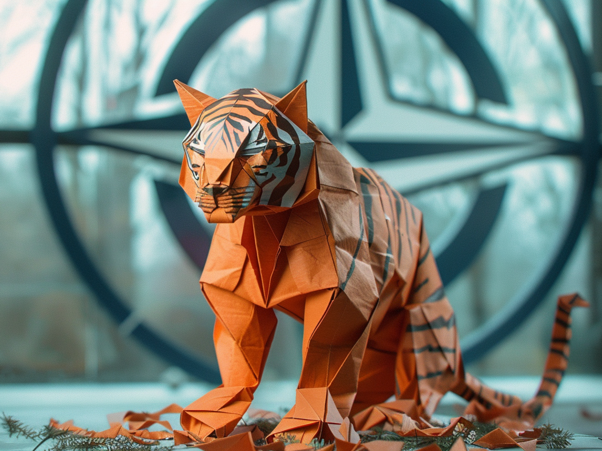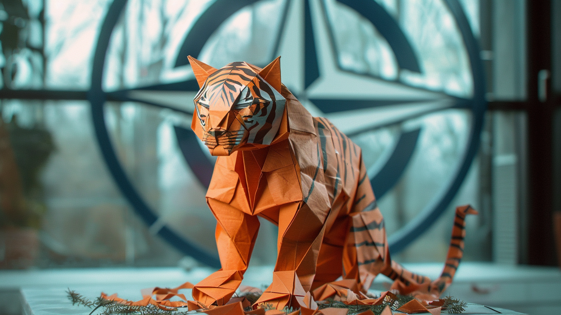 CC0 / Midjourney AI / A depiction of an Origami paper tiger sitting in front of a NATO logo, AI Generated