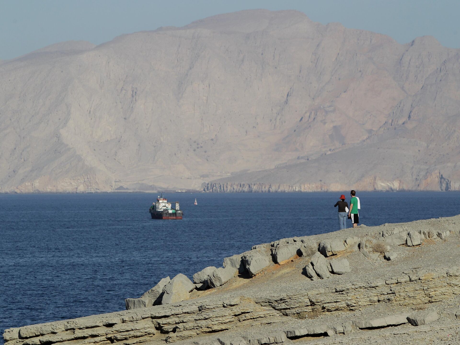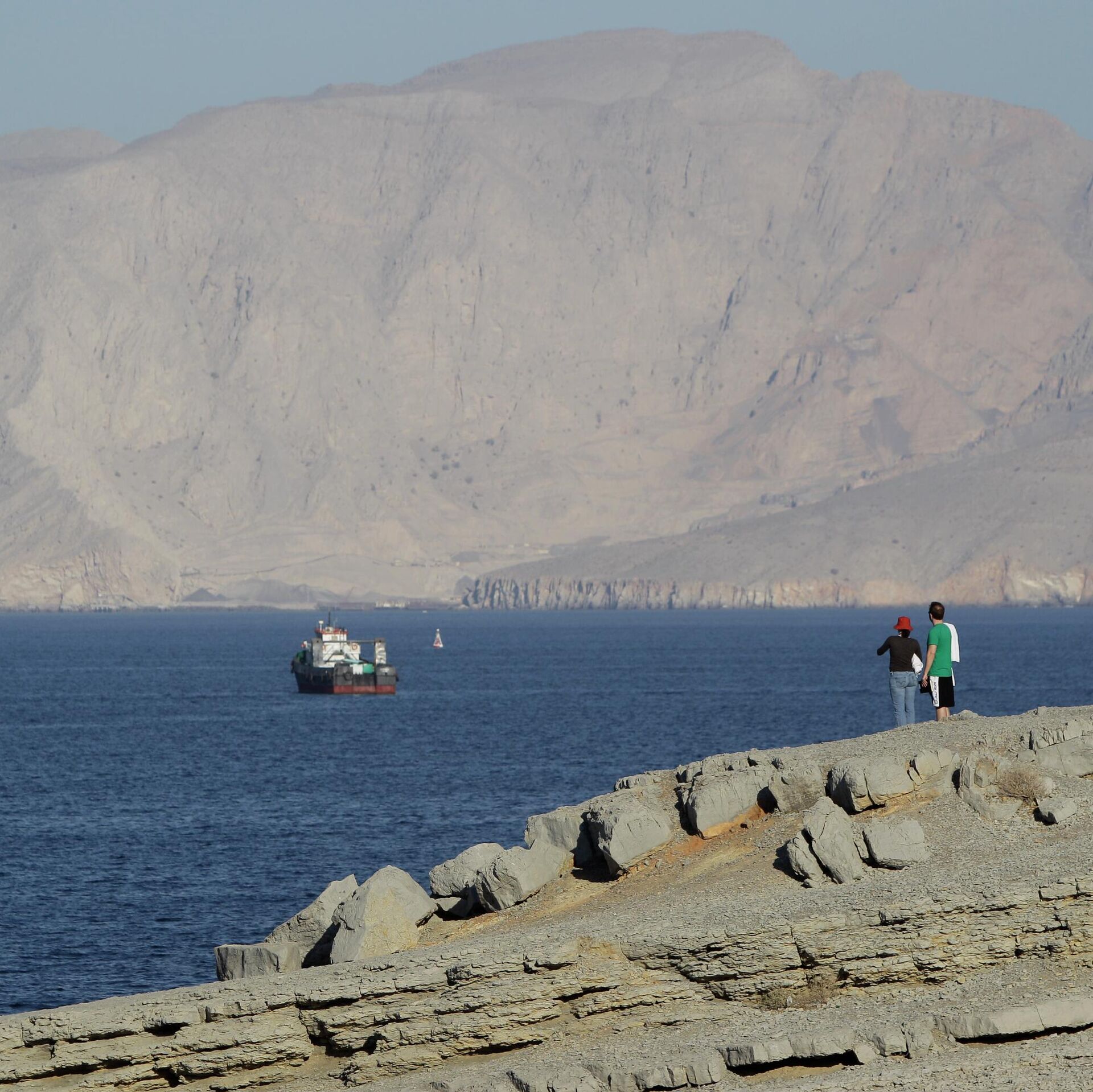 © AP Photo / Kamran JebreiliA tourist couple watches the mountains in south of the Strait of Hormuz as the trading dhows and ships are docked on the Persian Gulf waters near the town of Khasab, in Oman