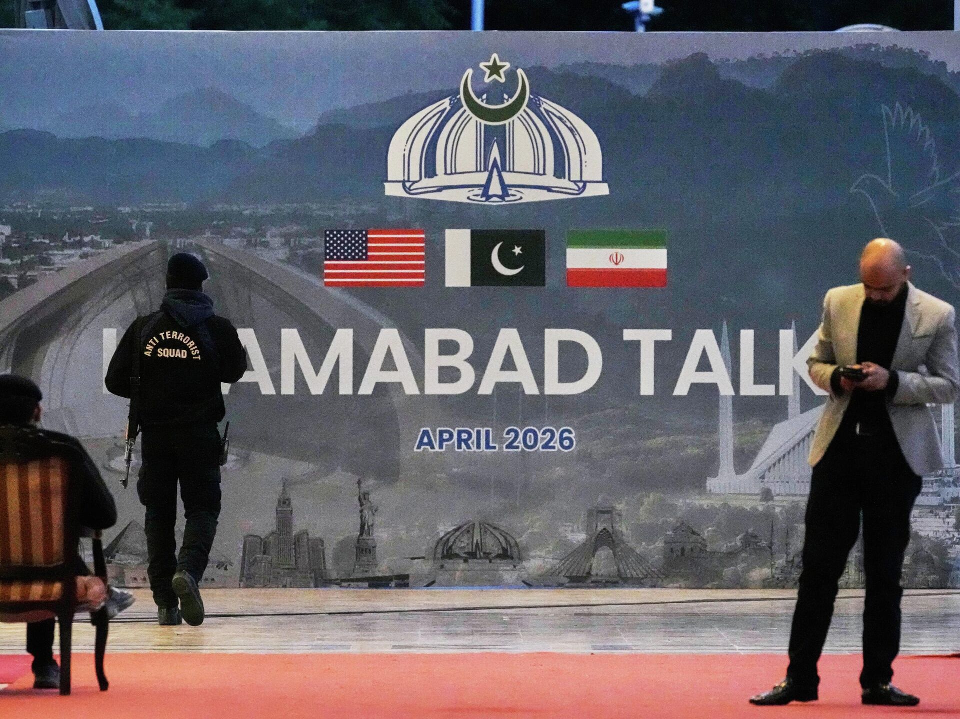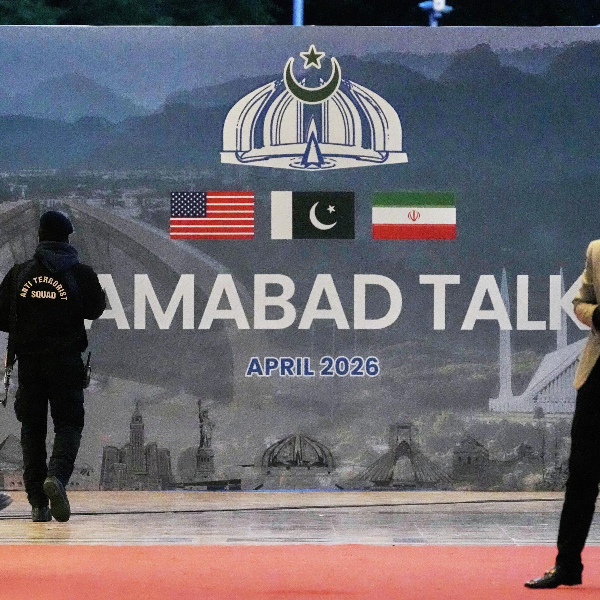 © AP Photo / Anjum NaveedA security guard walks past a billboard of the U.S. Iran talks outside a media center set up for the coverage of the U.S. Iran official meeting, in Islamabad, Pakistan, April 12, 2026.