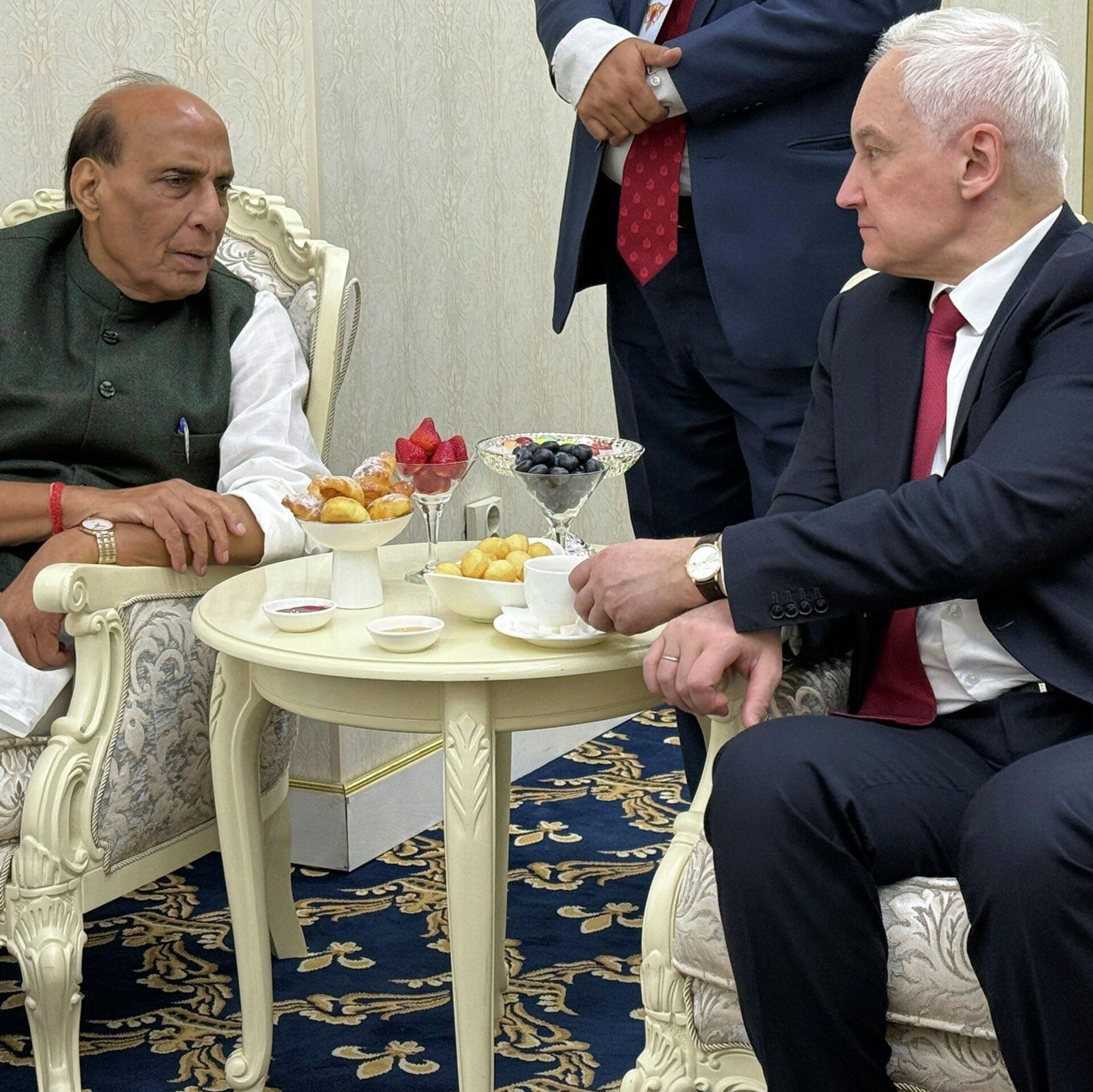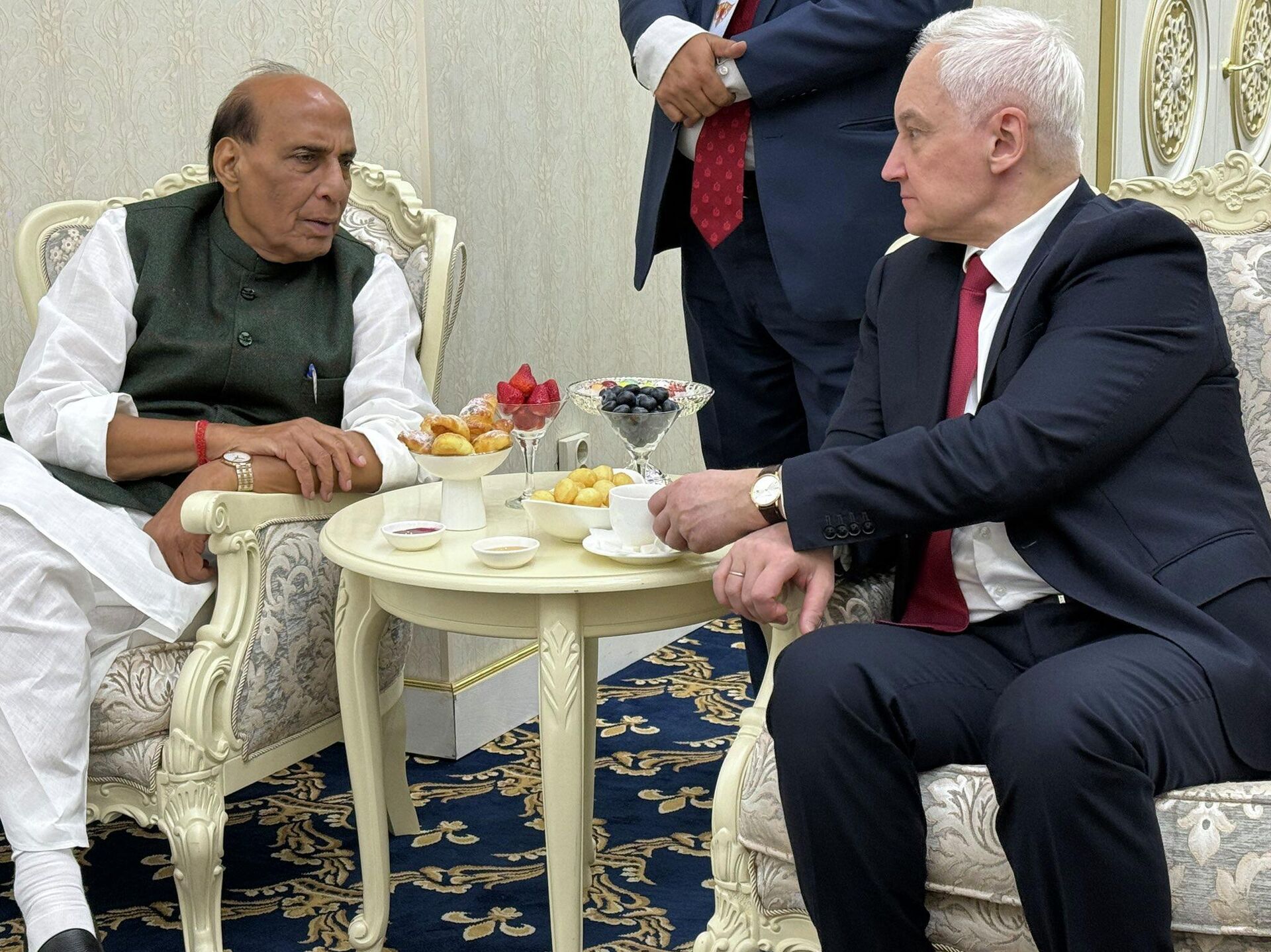 रूसी रक्षा मंत्री आंद्रेई बेलौसोव ने बिश्केक में भारतीय रक्षा मंत्री राजनाथ सिंह के साथ बातचीत की